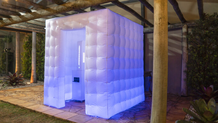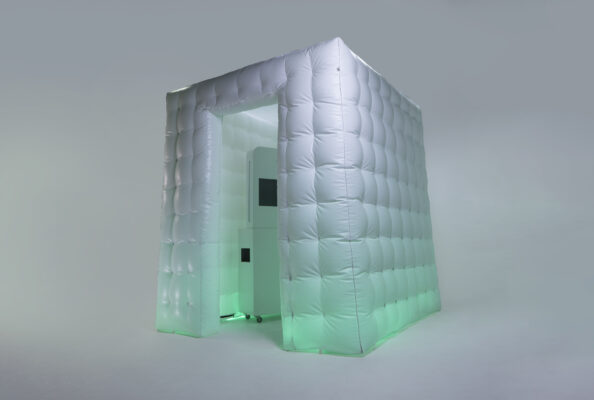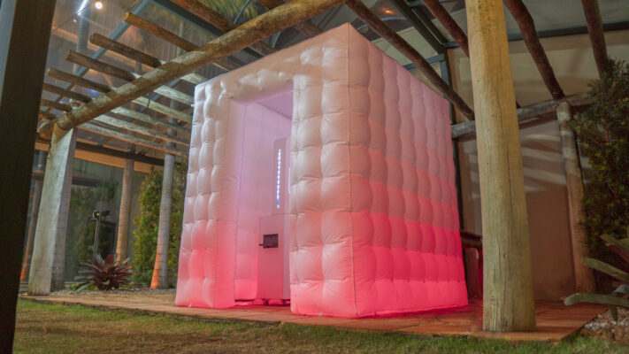 Cabine Inflável branca, com led colorido nas paredes, medindo 2m x 2m x 2,3m.